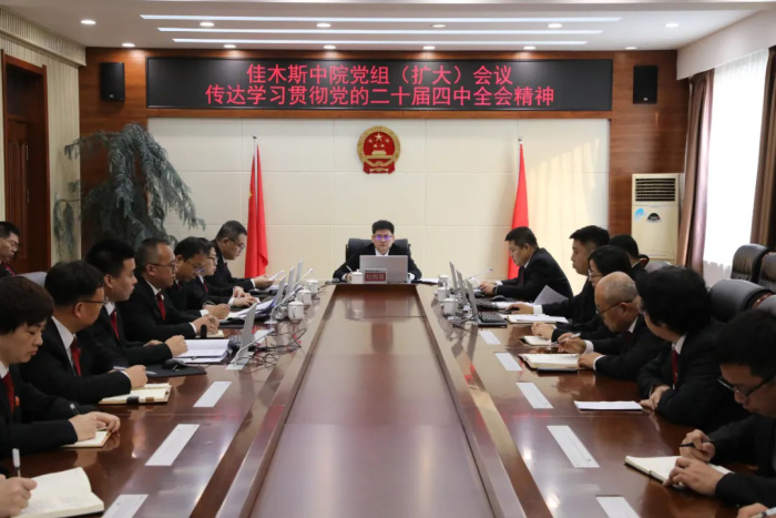10月29日,佳木斯中院召开党组(扩大)会议,传达学习贯彻党的二十届四中全会精神以及最高法院、省法院、市委关于贯彻落实全会精神相关会议的部署要求,研究贯彻落实举措。佳木斯中院党组书记、代理院长刘雨茎主持会议并讲话。