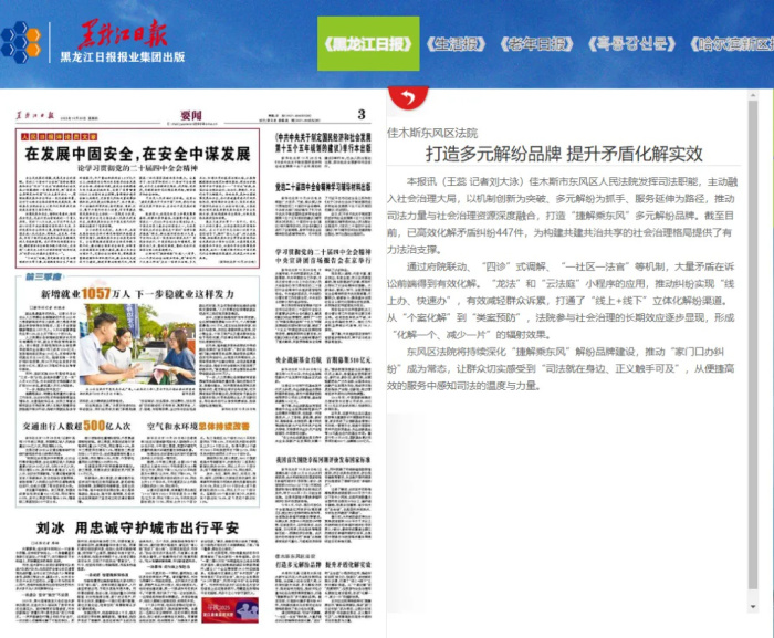 佳木斯市东风区人民法院发挥司法职能,主动融入社会治理大局,以机制创新为突破、多元解纷为抓手、服务延伸为路径,推动司法力量与社会治理资源深度融合,打造“捷解乘东风”多元解纷品牌。截至目前,已高效化解矛盾纠纷447件,为构建共建共治共享的社会治理格局提供了有力法治支撑。