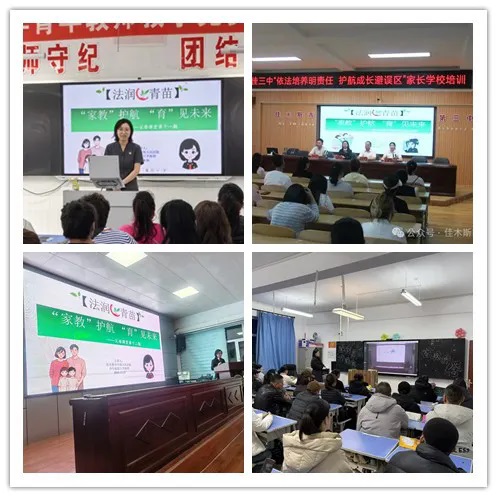 佳木斯中院“佳法•青苗”团队积极回应学校普法订单需求,分别为市第三中学、市五中教育集团六中校区、市二十中教育集团长青校区三所学校家长讲授《家庭教育促进法》专题法治课。为解决初中生父母“没时间参与家校活动”的难题,三期“父母课堂”均结合前期家长反馈及实际需求,创新采用夜校形式,动态调整授课时间,将周末及晚间放学前家长在校外的无聊刷手机“空等时间”转变为家庭教育的“充电时间”,有效推动法家校协同发力。
