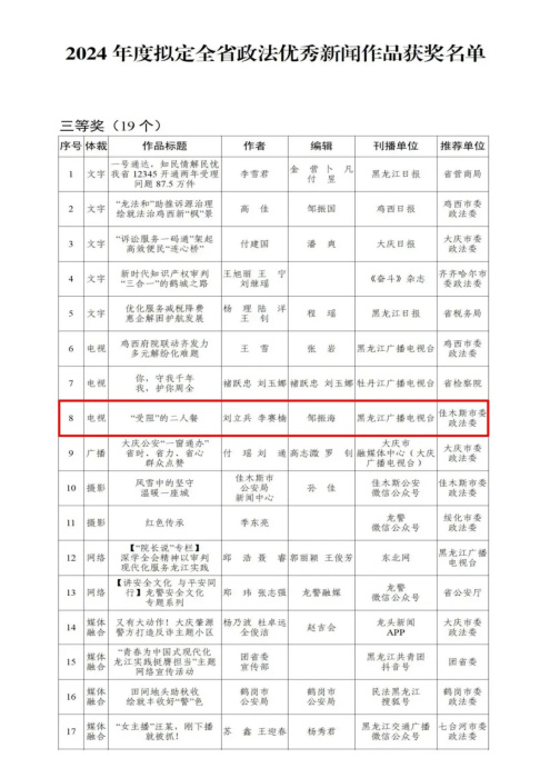 近日,2024年度黑龙江省政法优秀新闻作品评选结果公示,桦川法院作品《“受阻”的二人餐》在全省众多参评作品中脱颖而出,喜获三等奖。