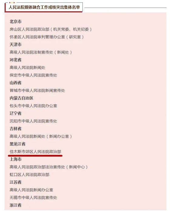 喜讯传来!佳木斯市郊区人民法院政治部斩获“人民法院媒体融合工作成绩突出集体”荣誉,成为全省法院系统唯一获此表彰集体,以优异实绩擦亮佳木斯法院宣传工作品牌。