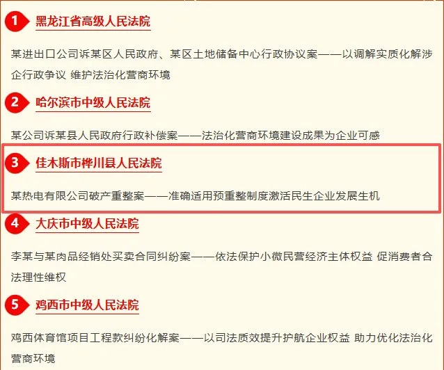 近日,省委政法委印发《关于政法机关助力优化营商环境典型案例评选情况的通报》,公布30件具有示范意义和推广价值的典型案例。其中,桦川县人民法院审理的桦川协联热电有限公司破产重整案成功入选。